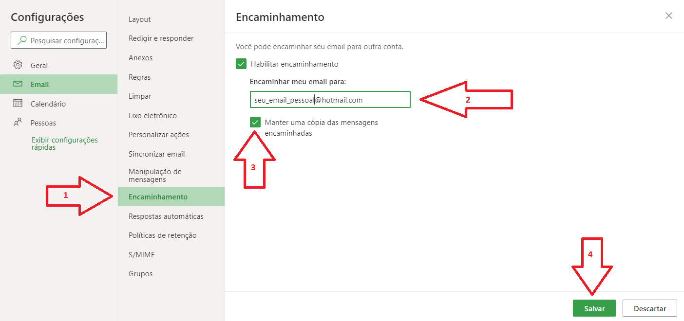 2) digite seu email 'particular' na caixa "Encaminhar meu email para:"